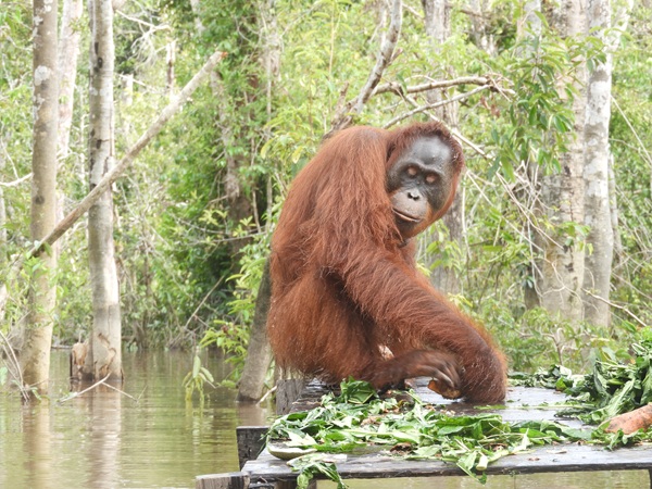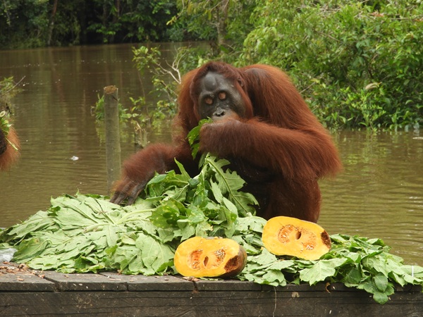 When supplementary food is offered, Meki prefers to carry her food into the trees rather than eat at the platform- an encouraging sign of natural forest instincts. Meki especially loves papaya leaves, dragon fruit, eggs, and melon, but also loves to forage. The team have observed Meki peel and nibble the bark of a Syzygium tree and browse the tender young leaves of putat (Planchonia valida).